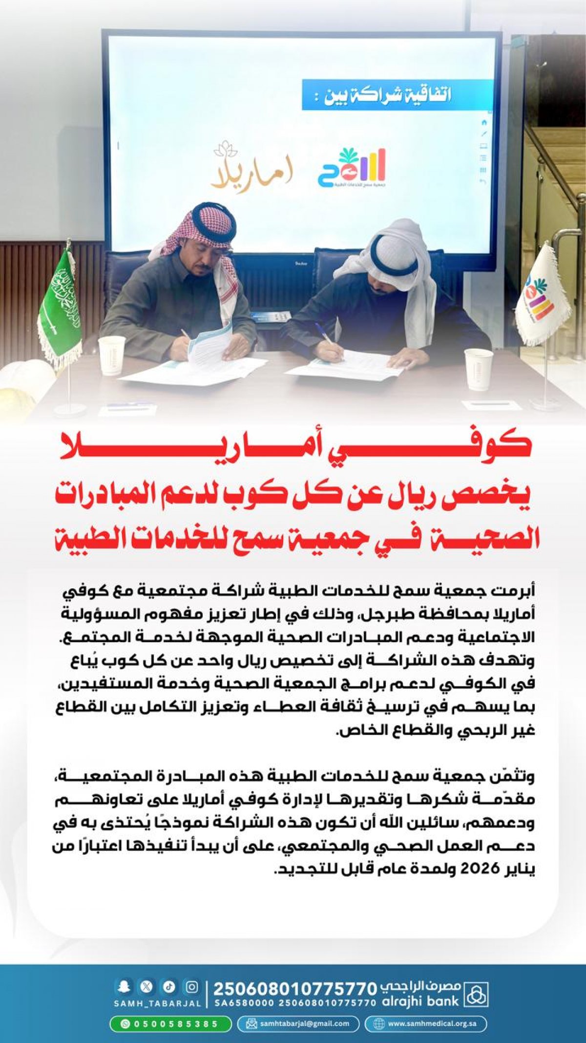 شراكة مجتمعية: كوفي أماريلا يخصص ريال عن كل كوب لدعم المبادرات الصحية في جمعية سمح للخدمات الطبية